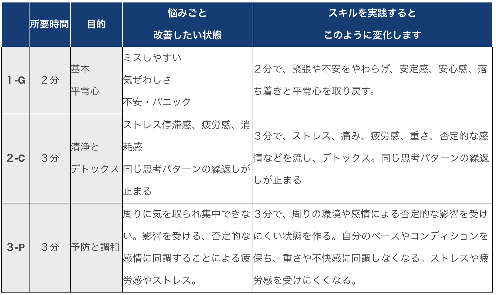 所要時間2分、3分、3分で、基本となる3つのスキルを学びます。心身コンディショニングが短時間で可能となる背景にあるのは、人間の「エネルギー機能の知識・理解・体感」です。具体的には、呼吸、筋肉、イメージの力を特定の方法で用いることで、もともと本来、誰もがもつ「平常心」「しぜんなリラックス状態」「恒常性を保つ力」を取り戻すことを助けます。